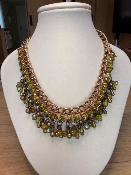 Colar no metal cor ouro velho e com pedras de strass e contas.