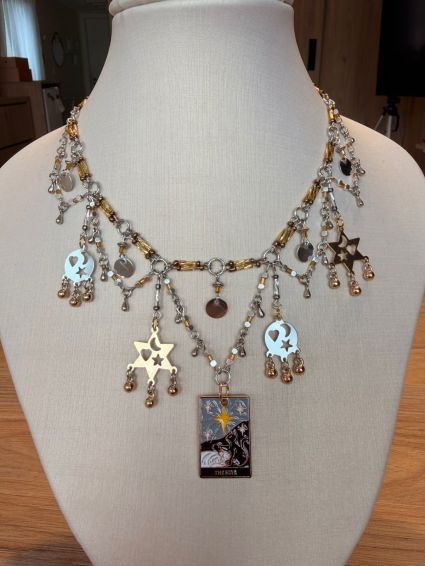 Colar em metal dourado e prateado, pingentes de sol, lua e carta de Tarot